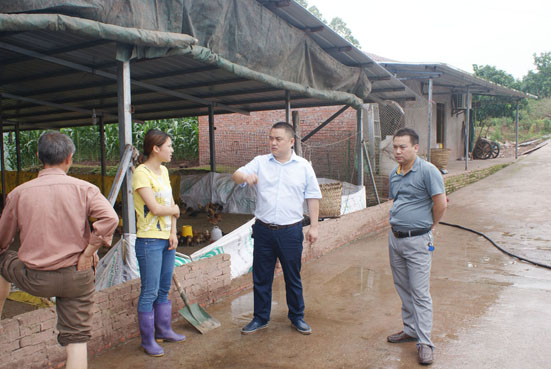 武胜县永胜乡党委书记华力(右二)乡长李晓斌(右一)下乡为养殖户排忧解难