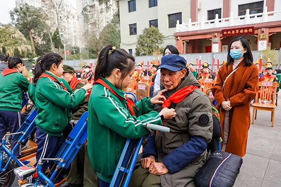 当日,来自新都区龙安小学的少先队红领巾志愿者们先后为革命老战士佩戴上鲜艳的红领巾,表演了手势舞《我们的名字叫中国》、诗朗诵《满江红》等节目,以此向英勇奋战的老战士表达崇高的敬意。