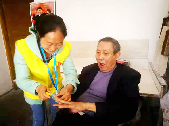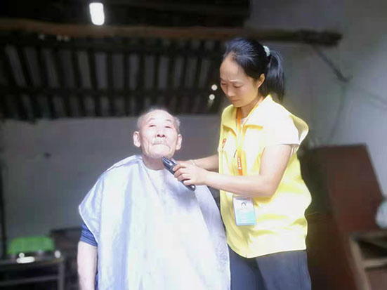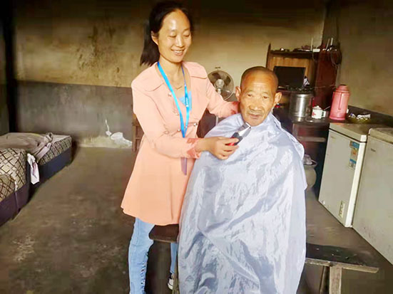 蒋伦琼对第一次去江门镇双莲村黄代朝老人家上门服务时的情景还记忆犹新,那是2020年11月的一个雨天,蒋伦琼穿着雨衣和胶鞋,背着包,走过漫长的泥泞山路,来到半间土坯房,这里杂草丛生,很是荒凉,蒋伦琼甚至有些怀疑自己走错了地方。蒋伦琼敲了很久的门,还对着窗户里喊了好几声,黄代朝老人才诧异又防备地探出了头,蒋伦琼热情又耐心的自我介绍让老人慢慢放下了戒心。黄代朝老人满脸胡须,头发凌乱,他77岁的老伴朱连章患有心肌炎和心脏病,二老的三个女儿已外嫁,三个儿子有两个已过世,另外一个患有精神病,生活起居还需二老照顾。看到屋子里胡乱摆放的杂物,蒋伦琼立马投入工作,打扫卫生、整理居室;给黄代朝老人剃胡须、理头发、剪指甲;为二老测量血压、与二老拉家常。如今,蒋伦琼已经为这对老人服务了两年多了,每次服务完离开时,两位老人总是拉着她的手不停说:“你每个月都来帮我家打扫卫生,还帮我们洗衣服,太感谢你了……”