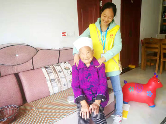 蒋伦琼为老人做护理服务