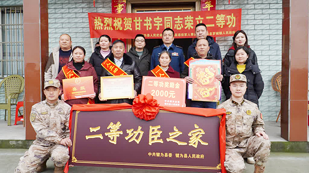 送喜报队伍一抵达,邻里乡亲纷纷夹道欢迎,掌声与锣鼓声交织成一曲欢快的乐章。领导们亲自为甘书宇的家属佩戴上写有“一人立功,全家光荣”的绶带,并庄重地送上“二等功臣之家”的牌匾和立功喜报。甘书宇的父亲甘玉贵接过喜报时说:“非常高兴,儿子在部队荣获了二等功,我们感到非常骄傲。感谢地方各级领导对他的关心和帮助,部队各位首长对他的关怀,我希望儿子在部队继续好好学习,争取再立新功,为部队争光,为家乡添彩。”